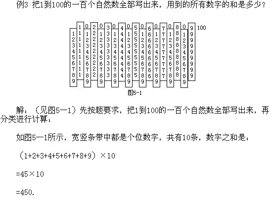 解:(見(jiàn)圖5—1)先按題要求,把1到100的一百個(gè)自然數(shù)全部寫(xiě)出來(lái),再分類進(jìn)行計(jì)算: